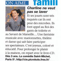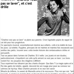 Après Charline veut pas de petit frère, et Charline veut pas aller à l’école, voici le troisième épisode des aventures de notre petite héroïne. Quelle plaisir de retrouver cette chipie de Charline, sa vivacité, son « sale caractère » et sa fantaisie ! Elle ne veut toujours pas faire ce qu’on lui dit de faire, mais s’interroge avec intelligence sur ce que les adultes trouvent si « normal ». À quoi ça sert de se laver ? Pourquoi faudrait-il obéir aux adultes pour aller faire sa toilette ? Pourquoi avoir peur des microbes ? Le spectacle réunit marionnettes, théâtre, danse et chant et fait participer les jeunes spectateurs pour aider Charline et chanter avec elle sur la musique pétillante et joyeuse d’Edward Auslender.
