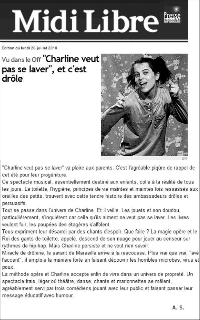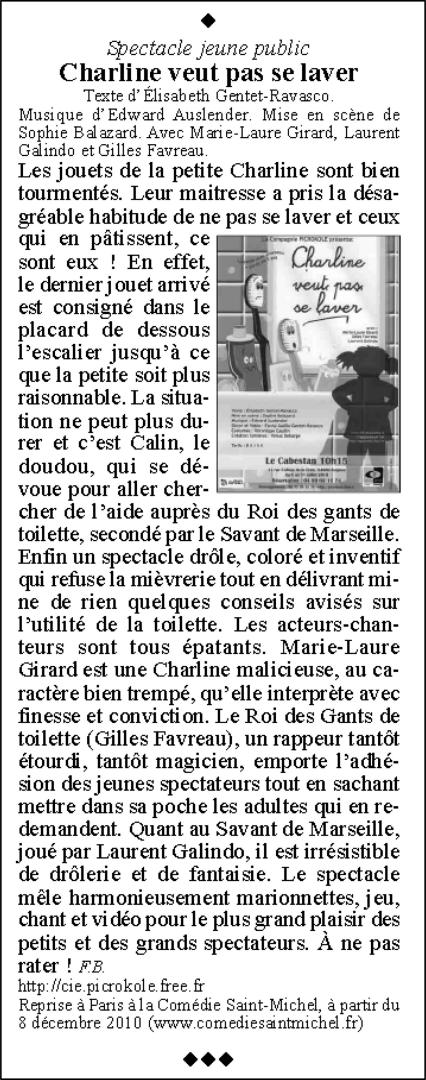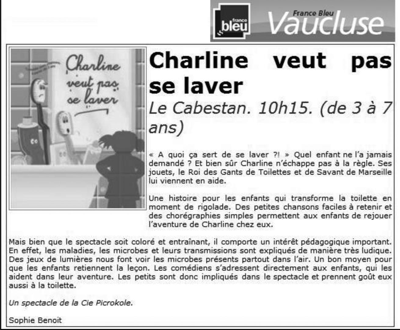 Après Charline veut pas de petit frère, et Charline veut pas aller à l’école, voici le troisième épisode des aventures de notre petite héroïne. Quelle plaisir de retrouver cette chipie de Charline, sa vivacité, son « sale caractère » et sa fantaisie ! Elle ne veut toujours pas faire ce qu’on lui dit de faire, mais s’interroge avec intelligence sur ce que les adultes trouvent si « normal ». À quoi ça sert de se laver ? Pourquoi faudrait-il obéir aux adultes pour aller faire sa toilette ? Pourquoi avoir peur des microbes ? Le spectacle réunit marionnettes, théâtre, danse et chant et fait participer les jeunes spectateurs pour aider Charline et chanter avec elle sur la musique pétillante et joyeuse d’Edward Auslender.